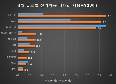9월 한 달간 글로벌 전기차용 배터리 사용량(Gwh)