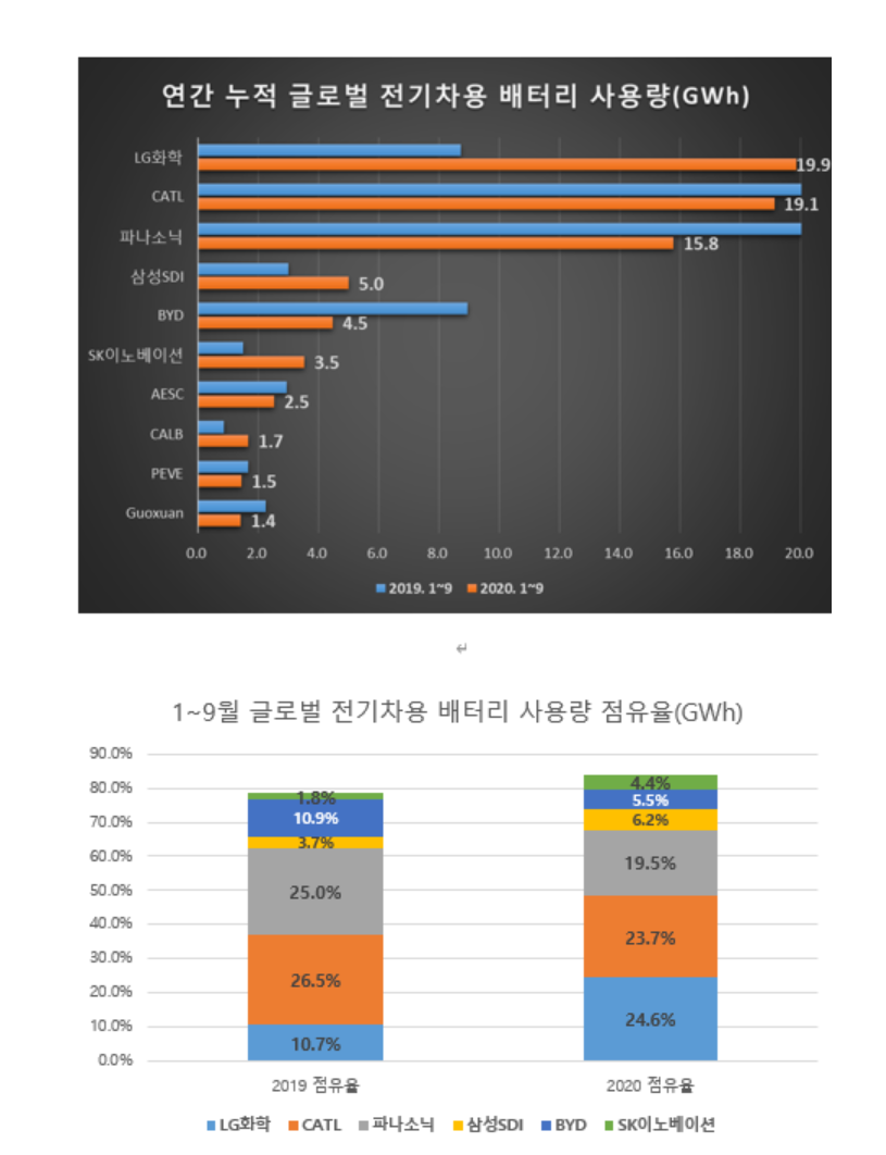 2020년 1~9월 누적 배터리 사용량 기준 LG화학은 19.9Gwh, 2위 업체인 CATL은 19.1 Gwh로 나왔습니다.