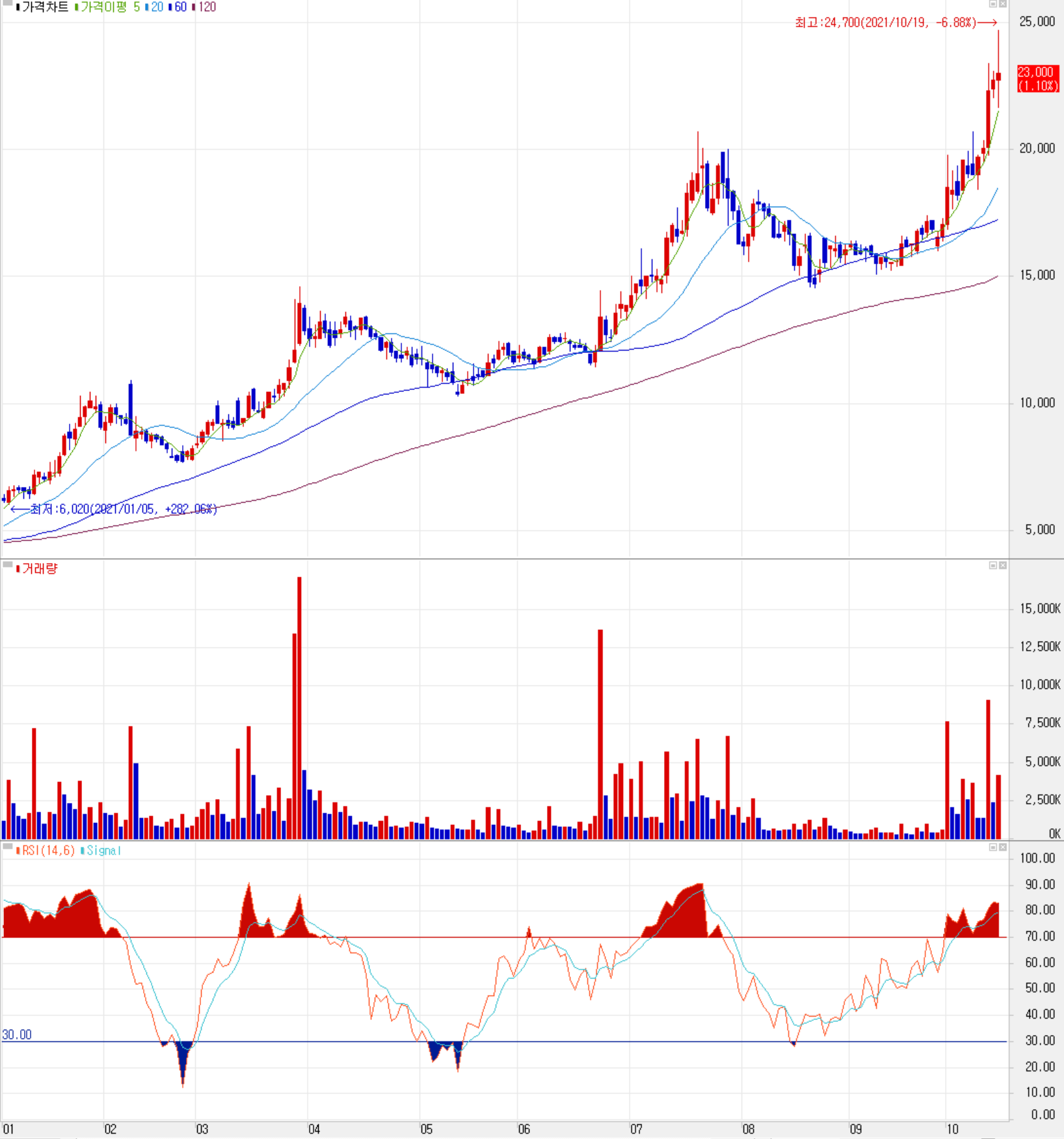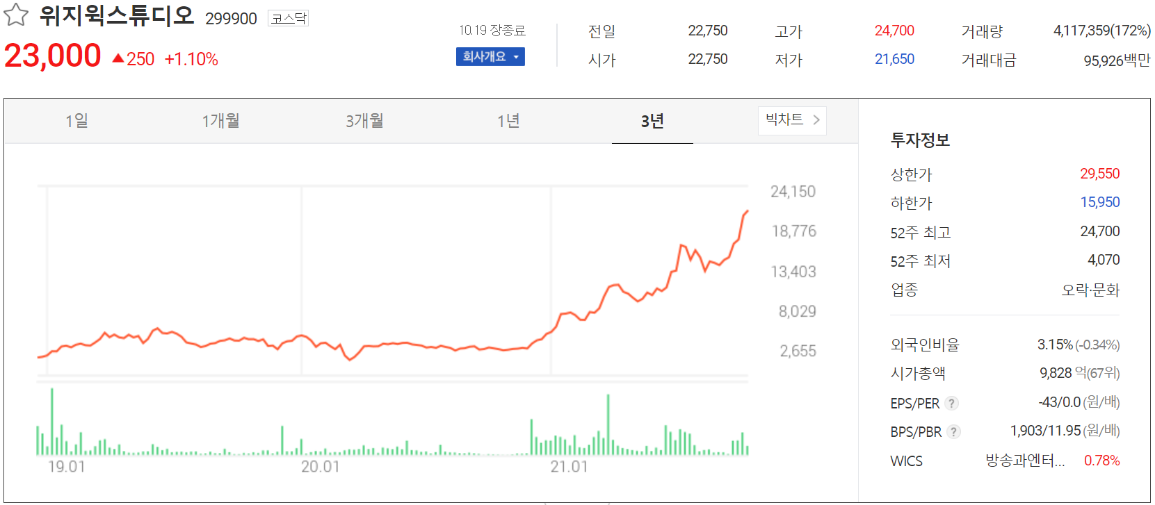 10월 19일 장 종료 기준 당사의 주가는 전일보다 1.1% 오른 23,000원에 거래를 마감했습니다. 외국인 비율은 3.15%이며, 시가총액 9,828억 원으로 코스닥 시총 기준 67위 종목입니다.