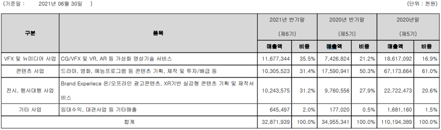 당사는 드라마 제작사인 (주)래몽래인, 전시 광고 전문 기업인 ANP커뮤니케이션즈, 예능/드라마 제작 기업인 (주)이미지나인컴즈 등을 자회사로 확보하면서 영화뿐만 아니라, 드라마, 예능, 공연, 광고 및 뉴미디어 등으로 구성되어 종합 미디어 콘텐츠 제작 사업을 영위하고 있습니다. 지난 상반기 VFX 및 뉴미디어 사업부문의 매출은 117억 원으로 전체 매출의 35.5%를 차지하였으며, 콘텐츠 사업은 103억 원으로 31.4%, 전시 및 행사대행 사업부문은 102억 원으로 31.2%의 매출 비중을 기록했습니다.