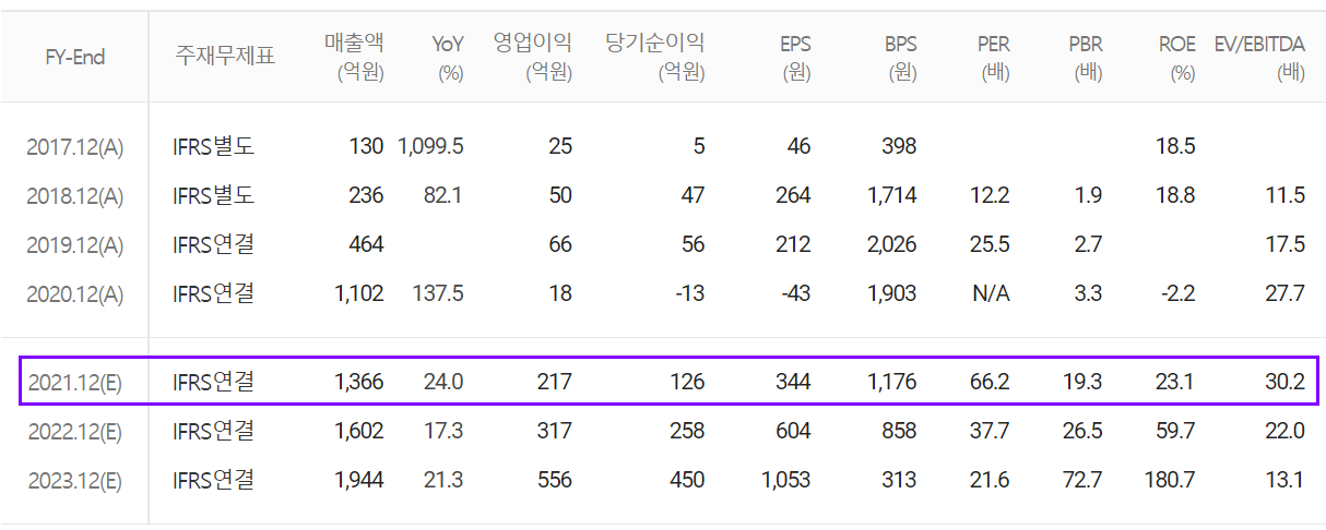 당사의 2021년 예상실적은 매출액 1,366억 원으로 전년 대비 24% 증가하고, 영업이익은 217억 원으로 1,106% 증가할 것으로 추정했습니다. VFX 사업 및 전시 행사 등의 사업이 코로나 19에서 점차 회복 국면으로 접어들고 있으며, 콘텐츠 제작 사업 또한 꾸준한 실적이 예상되고 있습니다. 또한 최근 종합 미디어 콘텐츠 제작업체로 발돋움하기 위한 주요 종속기업의 인수에 이어, 당사의 최대 주주가 모바일 게임업체인 컴투스로 변경되면서 메타버스 관련 사업 모델의 개발 등 시너지 효과를 기대하면서 당분간 수익성 개선과 함께 매출 성장도 전망하고 있습니다.