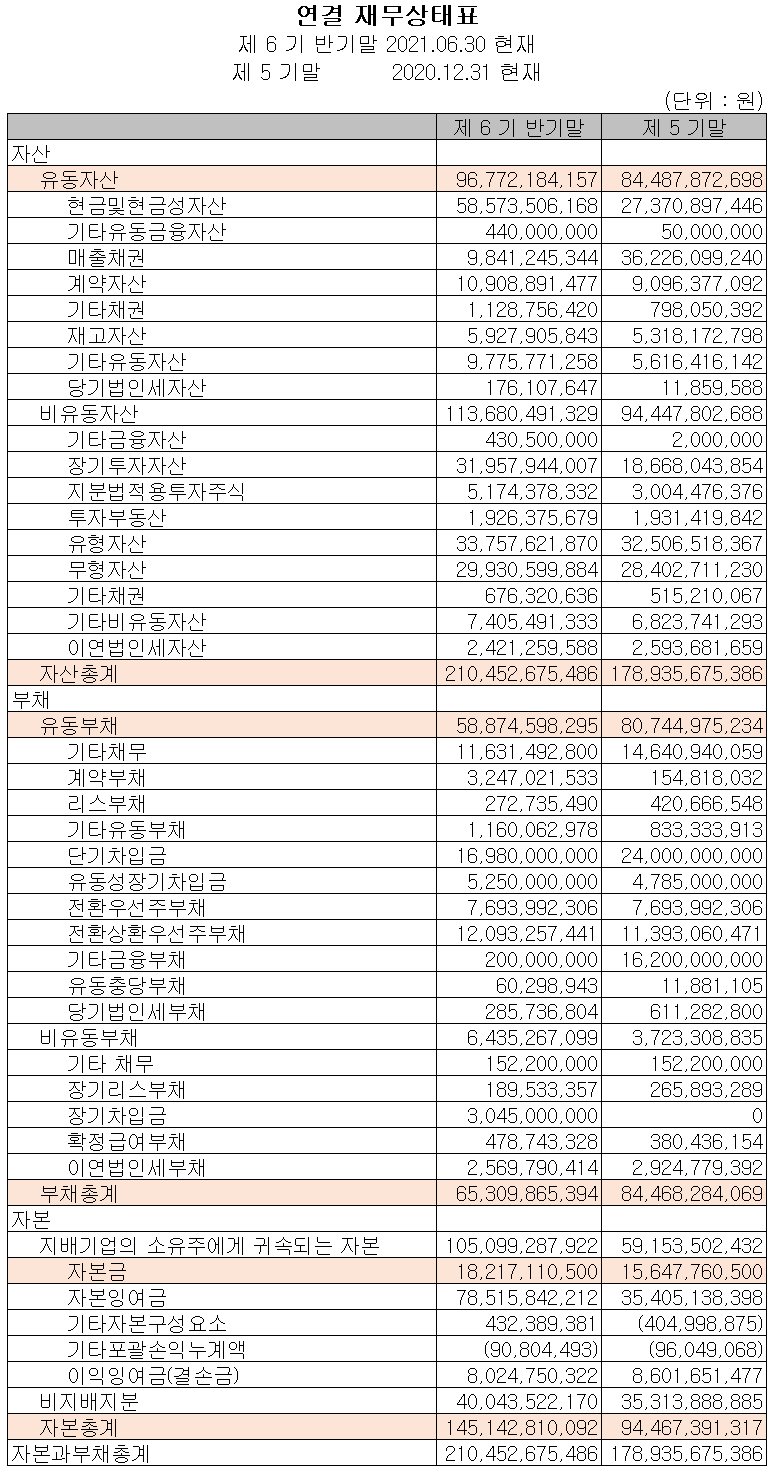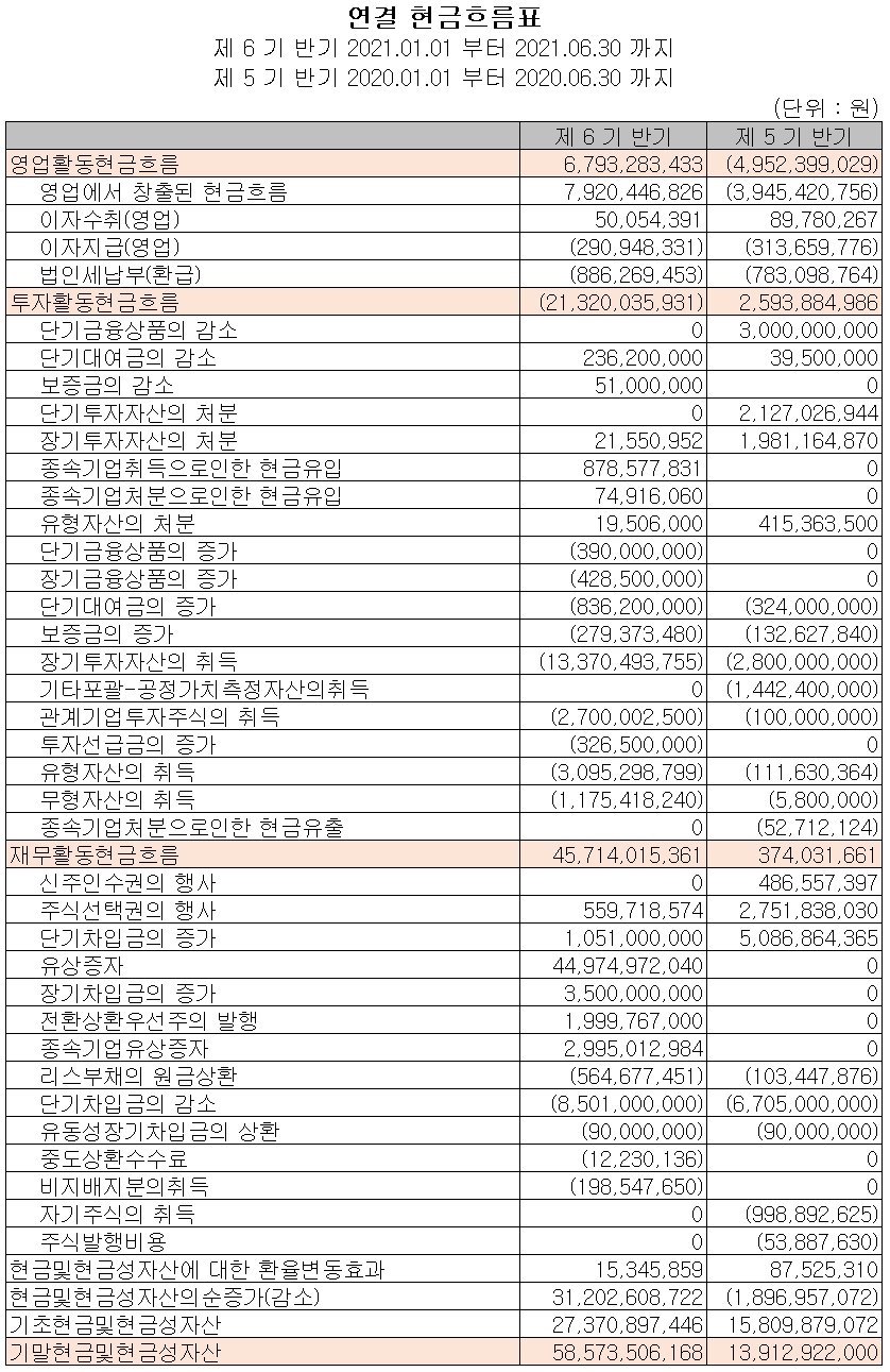 지난 상반기 영업활동 현금흐름에서는 68억 원의 현금이 유입되었으며, 투자활동에서는 장기투자자산의 취득 및 유무형 자산의 취득과 종속회사 (주)고즈넉이엔티, 골드프레임(주)의 지분 취득으로 인해 213억 원의 현금이 유출되었습니다. 재무활동에서는 당기 유상증자 및 주식 선택권 행사, 차입금 차입 등으로 자금을 조달하여 당기 부채를 상환하고, 비지배지분을 취득하면서 457억 원의 현금이 유입되었습니다. 2021년 상반기 말 기준 현금 및 현금성 자산은 전년 동기 말보다 447억 원이 증가한 586억 원을 보유하고 있습니다.