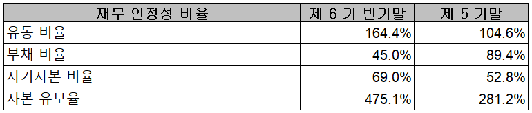 2021년 상반기 말 기준 당사의 재무안정성 비율에서는 유동비율 164.4%, 부채비율 45%, 자기자본비율 69%, 자본유보율 475.1%를 기록하면서 전반적으로 양호한 재무상태를 기록했습니다.