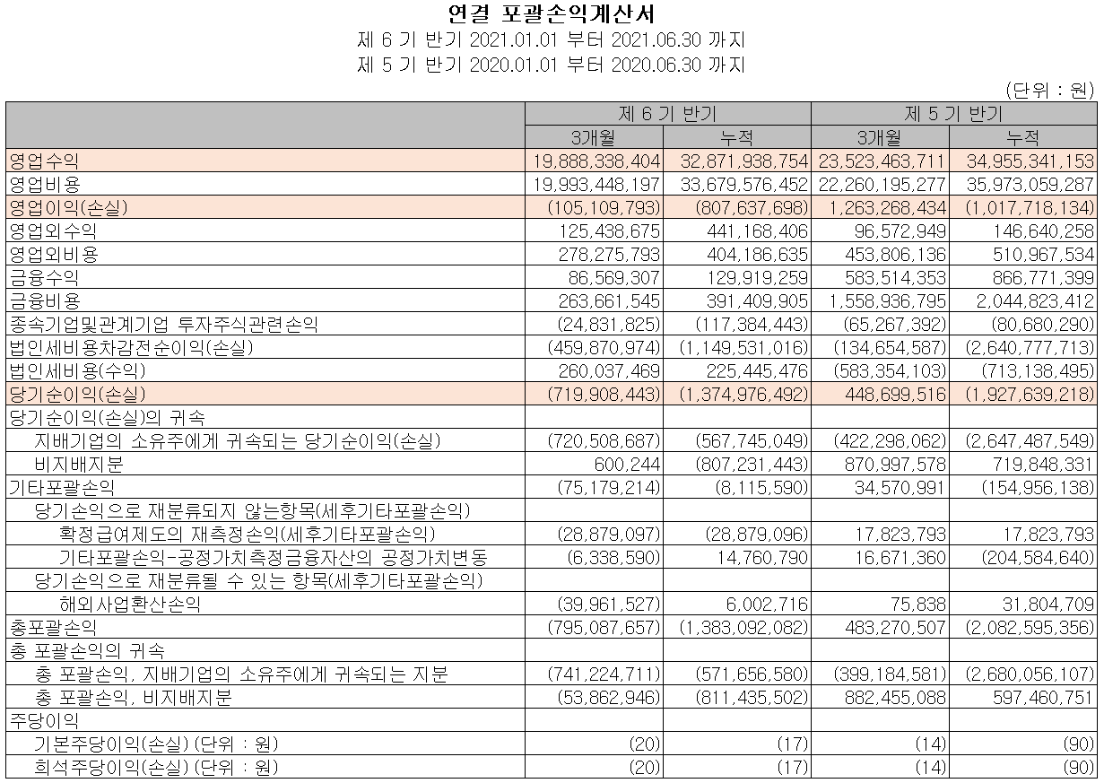 지난 상반기 당사의 실적은 매출액 329억 원으로 전년 동기 대비 15.5% 감소했고, 영업손실 1억 원과 당기순손실 7억 원으로 전년도 상반기 대비 적자지속입니다. 매출 감소와 인건비 등 고정비 부담에 따라 적자를 기록했습니다.