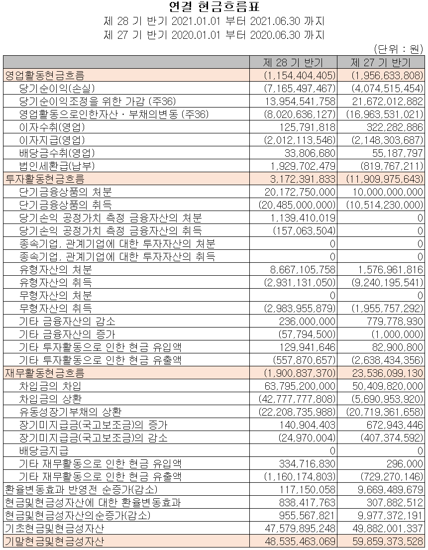 지난 상반기 영업활동 현금흐름에서는 운전자산의 변동과 당기순손실로 총 12억 원의 현금이 유출되었으며, 투자활동에서는 유무형 자산의 취득이 있었으나 운휴 유형자산 등의 처분으로 총 32억 원의 현금이 유입되었습니다. 재무활동에서는 차입금을 차입하여 당기 부채를 상환하였습니다. 지난 상반기 말 기준 현금 및 현금성 자산은 전년 동기 말보다 113억 원이 줄어든 485억 원을 보유하고 있습니다.