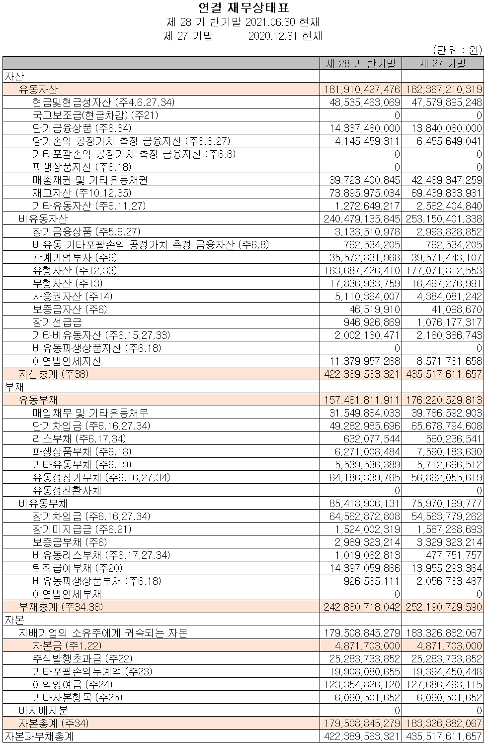 지난 상반기 말 현재 자산총계는 전기 말보다 3% 감소한 4,224억 원으로 유형자산의 감소에 기인합니다. 부채총계는 3.7% 줄어든 2,429억 원으로 매입채무 및 단기 차입금의 감소에 따릅니다.