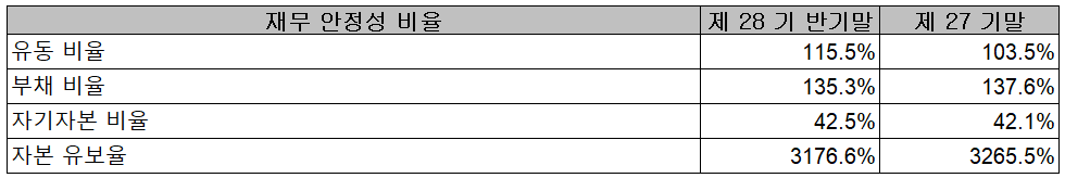 2021년 상반기 말 기준 재무안정성 비율에서는 유동비율 115.5%, 부채비율 135.3%, 자기자본비율 42.5%, 자본유보율 3,176.6%를 기록했습니다. MLCC 사업을 준비하면서 부채비율이 증가 추세였고, 연간 120억 규모의 비용 지출이 되고 있지만 MLCC 수주가 지연되는 문제로 재정 상태가 회복되지 못하고 있습니다. 최근 모바일향 부품 공급 및 자동차 전장 부품 공급이 늘어나고, 그동안 지연되었던 MLCC의 첫 수주로 양산이 시작되는 등 전반적인 실적 개선이 예상되고 있어 향후 재무상태도 호전될 것으로 전망하고 있습니다.