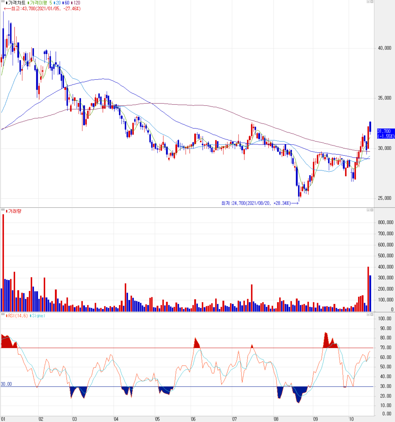 10월 20일 장 종료 기준 당사의 주가는 전일보다 1.55% 내린 31,700원에 거래를 종료했습니다. 외국인 비율은 3.43%이며, 시가 총액은 3,089억 원으로 코스닥 시총 기준 311위 종목입니다.