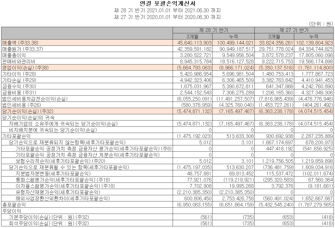 지난 2분기 당사의 실적은 매출액 456억 원으로 전년 동기 대비 35.7% 증가했고, 영업손실 57억 원과 당기순손실 55억 원으로 적자 지속입니다. 모바일 부문의 수요 감소가 이어지고 코로나19 등의 영향으로 MLCC 양산이 지연되면서 이에 따른 고정비 부담으로 적자가 지속되고 있습니다.