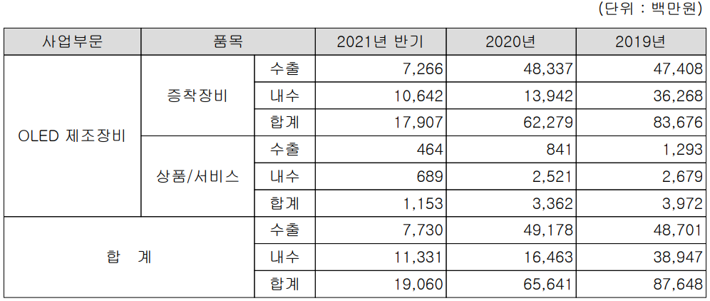 당사는 OLED 제조의 핵심 공정인 증착 공정에 필요한 장비를 생산하는 기업으로 OLED 디스플레이의 Sub Pixel을 제조하고, R&D 용 등의 증착 장비를 제조, 공급하고 있습니다. 지난 상반기 증착 장비의 매출은 179억 원으로 전체 매출의 93.95%를 차지하였으며, 증착 장비에 적용되는 소모품 및 상품과 서비스 용역의 매출은 12억 원으로 6.05%의 매출 비중을 기록했습니다.
