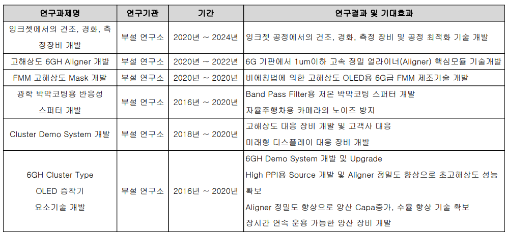 당사는 지난 상반기 매출액의 15.02%인 29억 원 규모의 비용을 투입하면서 당사의 주력 제품인 OLED 증착 장비 관련 고해상도 얼라이너 핵심모듈과 잉크젯 공정 중 건조 경화, 측정 장비 및 공정 최적화를 위한 연구를 수행하고 있습니다. 또한 지난 4월 정부 국책과제인 8.5G 대면적용 RGB 증착기 연구개발 기업으로 선정되면서 2024년까지 완료할 예정입니다.