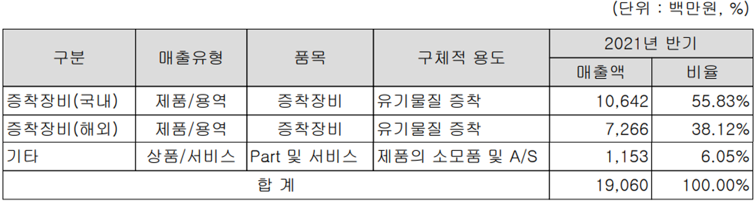 당사는 OLED 제조의 핵심 공정인 증착 공정에 필요한 장비를 생산하는 기업으로 OLED 디스플레이의 Sub Pixel을 제조하고, R&D 용 등의 증착 장비를 제조, 공급하고 있습니다. 지난 상반기 증착 장비의 매출은 179억 원으로 전체 매출의 93.95%를 차지하였으며, 증착 장비에 적용되는 소모품 및 상품과 서비스 용역의 매출은 12억 원으로 6.05%의 매출 비중을 기록했습니다.