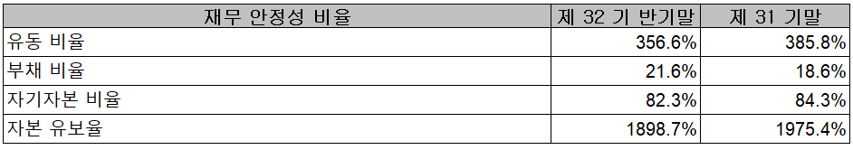 2021년 상반기 말 기준 재무안정성 비율에서는 유동비율 356.6%, 부채비율 21.6%, 자기자본비율 82.3%, 자본유보율 1,898.7%를 기록하면서 안정적인 재무상태를 유지하고 있습니다.