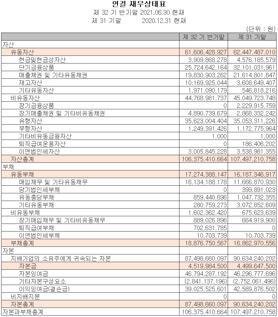 지난 상반기 말 현재 자산총계는 전기 말보다 1% 줄어든 1,064억 원이며, 부채총계는 11.9% 늘어난 189억 원으로 매입채무 및 차입금의 등 유동성 채무의 증가에 기인합니다.