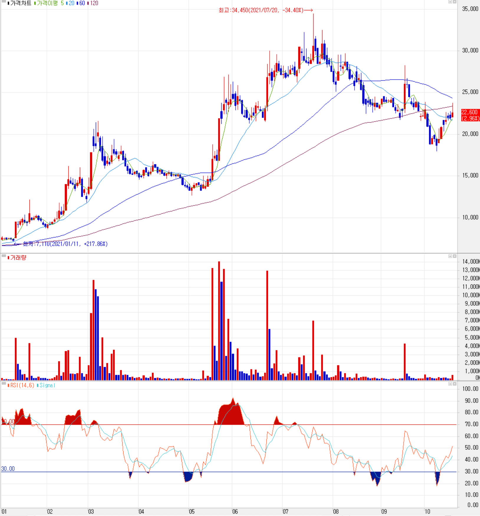 올해 들어서 당사의 주가는 메타버스 관련주로 묶이면서 꾸준한 상상세를 보이다가 8월 시장 변동성에 따른 일부 조정을 보였으나 최근 반등세를 나타내면서 2만 원 초반에서 주가가 형성되고 있습니다. 최근의 상승은 정부의 메타버스 사업 지원 소식이 전해지면서 7 거래일 연속 순매수 행진을 하고 있는 기관이 이끌고 있습니다. 당사의 사업 현황 및 차트 소견을 종합한 개인적인 목표주가는 30,000원으로 설정하였습니다.