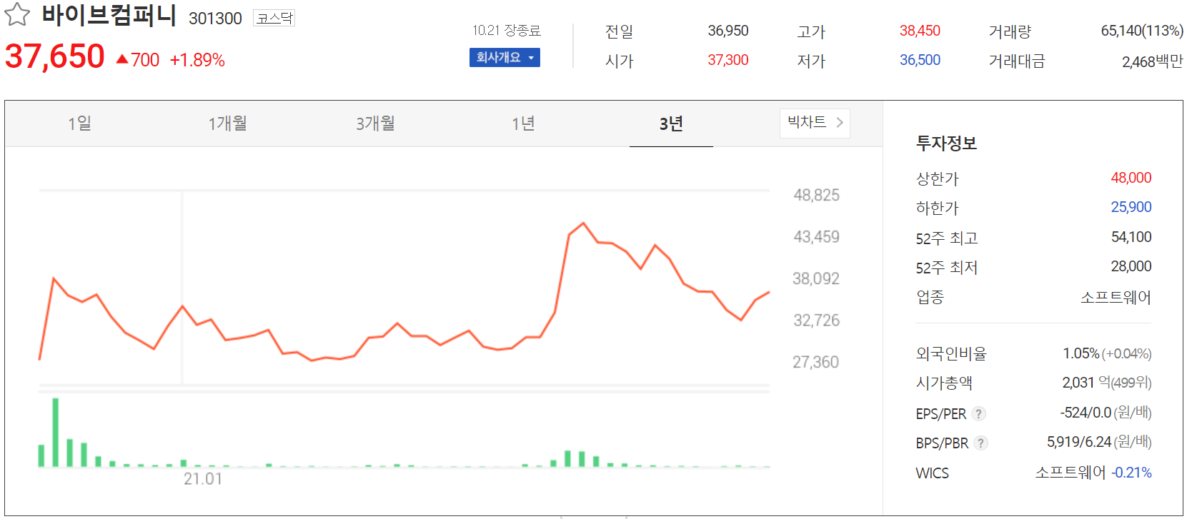 10월 21일 장 종료 기준 당사의 주가는 전일보다 1.89% 오른 37,650원에 거래를 마감했습니다. 외국인 비율은 1.05%이며, 시가 총액 2,031억 원으로 코스닥 시총 기준 499위 종목입니다.