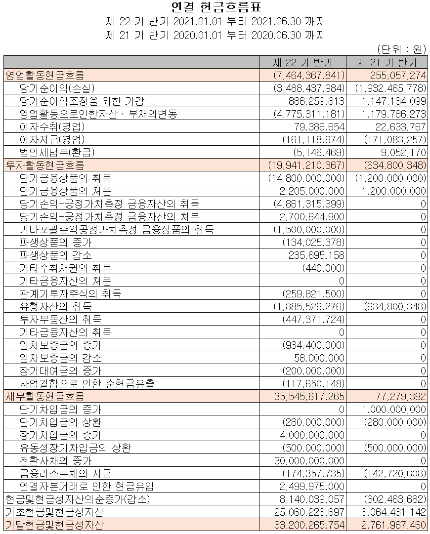 지난 상반기 말 기준 영업활동 현금흐름에서는 매출채권의 증가 및 유동부채의 감소 등으로 운전자산이 마이너스 흐름을 보였고, 당기순손실이 더해지면서 총 75억 원의 현금이 유출되었습니다. 투자활동에서는 단기금융상품의 취득과 유형자산의 취득 등으로 199억 원의 현금이 유출되었습니다. 재무활동에서는 장기차입금의 차입 및 전환사채(300억 원) 발행으로 자금을 조달하여 당기 부채를 상환하면서 355억 원의 현금이 유입되었습니다. 2021년 상반기 기준 현금 및 현금성 자산은 전년 동기 말보다 304억 원이 증가한 332억 원을 보유하고 있습니다.