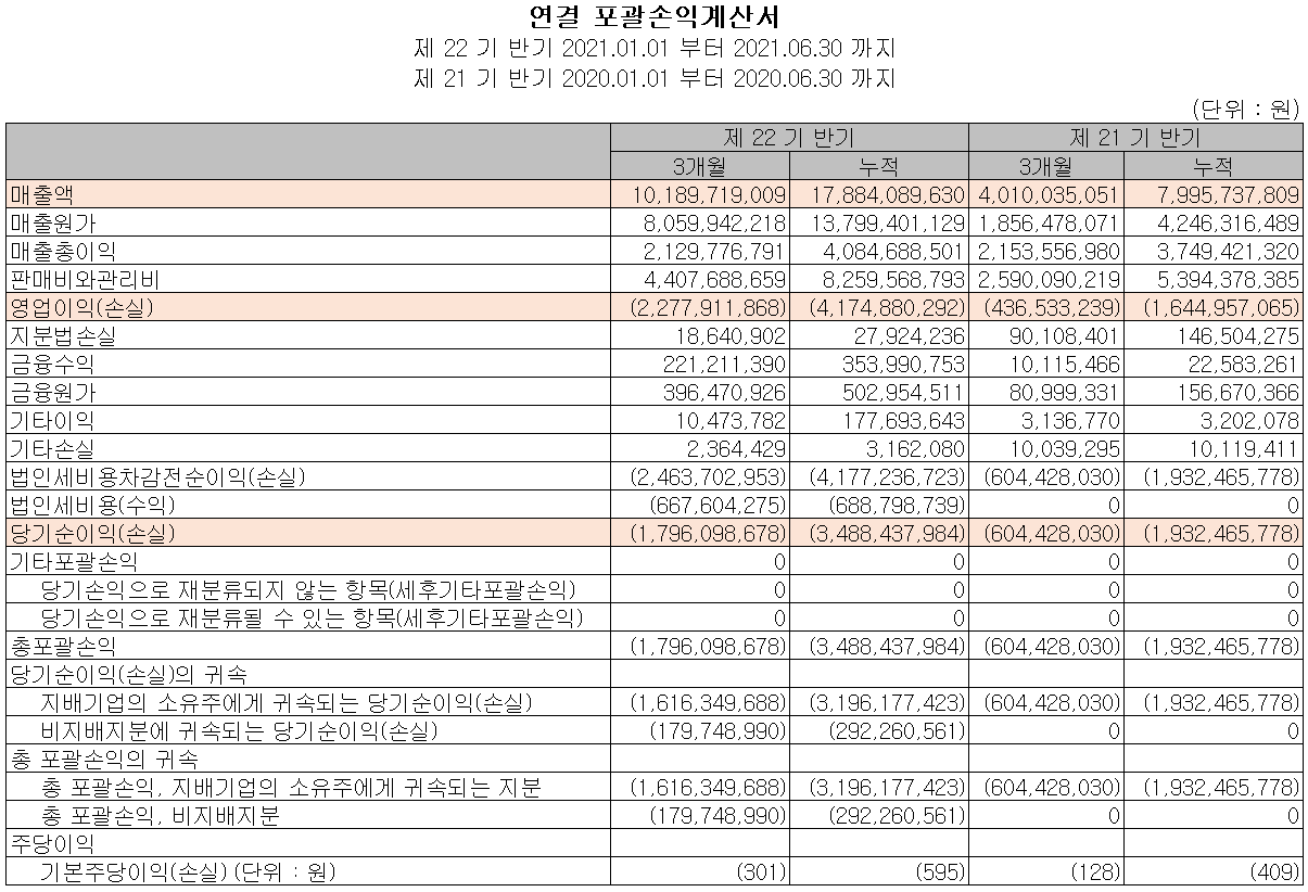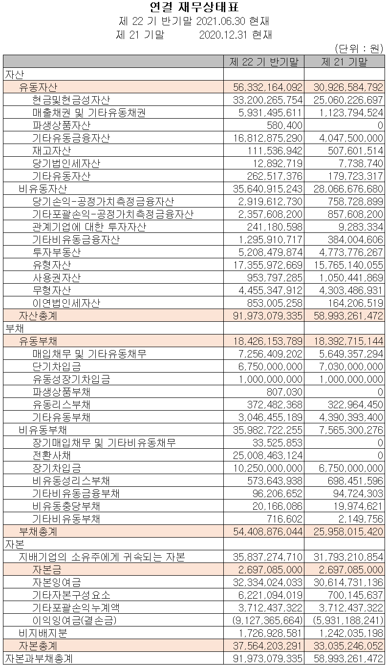 지난 상반기 말 현재 자산총계는 전기 말보다 55.9% 늘어난 920억 원으로 현금 및 현금성 자산, 매출채권, 기타유동금융자산, 공정가치 측정 금융자산 및 유형자산 등이 증가했습니다. 부채총계는 109.6% 늘어난 544억 원으로 전환사채의 발행과 장기차입금 차입에 기인합니다. 결손 누적금이 91억 원에 달하지만 전환사채 발행에 대한 전환권 대가로 인해 자본총계는 13.7% 늘어난 376억 원을 기록했습니다.