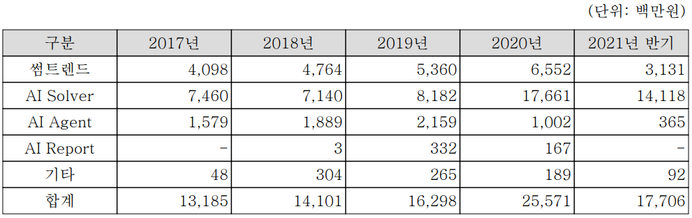지난 상반기 AI Solver의 매출은 141억 원으로 전체 매출의 79.74%를 차지하였으며, 썸트렌드는 31억 원으로 17.68%, AI Agent는 3.6억 원의 매출로 2.06%의 매출 비중을 기록했습니다.