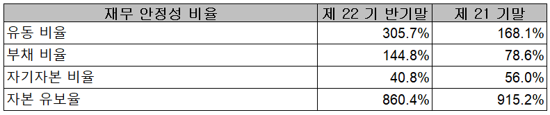 2021년 상반기 재무안정성 비율에서는 유동비율 305.7%, 부채비율 144.8%, 자기자본비율 40.8%, 자본유보율 860.4%를 기록했습니다. 메타버스, 디지털 트윈 등 신규 사업에 대한 투자를 위해 사채를 발행한 것으로 알려졌으며, 이에 따른 부채비율이 크게 증가했습니다.