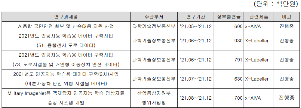 당사는 데이터 수집 및 처리에 대한 솔루션을 공급하는 단일 사업부문으로 제품 부문에는 NVIDIA GPU와 당사의 Uyuni 솔루션을 설치하여 판매되는 어플라이언스 제품, 그리고 Uyuni, AI 영상 데이터 가공 솔루션인 X-Labeller, 대용량 영상 데이터 분석 플랫폼인 X-AIVA 등 솔루션 제품이 있습니다. 또한 용역 부문에서는 대규모 데이터 수집 및 처리 솔루션인 X-DAMs 및 AI를 기반의 용역 사업, 데이터 가공을 통한 유통 사업 등을 을 영위하고 있습니다. 지난 상반기 어플라이언스 제품의 매출은 13억 원으로 전체 매출의 62.8%, AI용역 사업의 매출은 7억 원으로 33.3%의 매출 비중을 나타냈습니다.