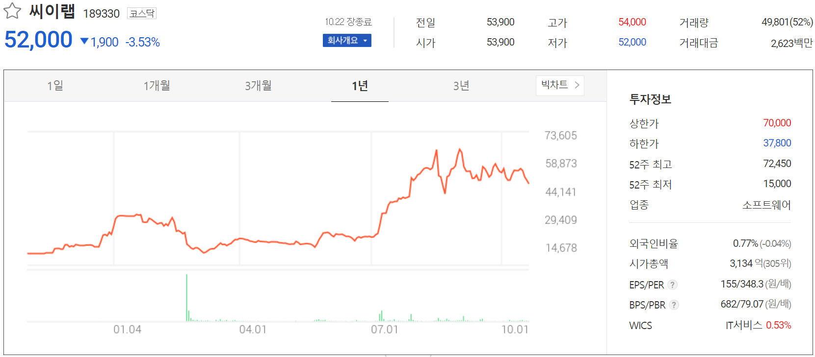 10월 22일 장 종료 기준 당사의 주가는 전일보다 3.53% 내린 52,000원에 거래를 마감했습니다. 외국인 비율은 0.77%이며, 시가총액은 3,134억 원으로 코스닥 시총 기준 305위 종목입니다.