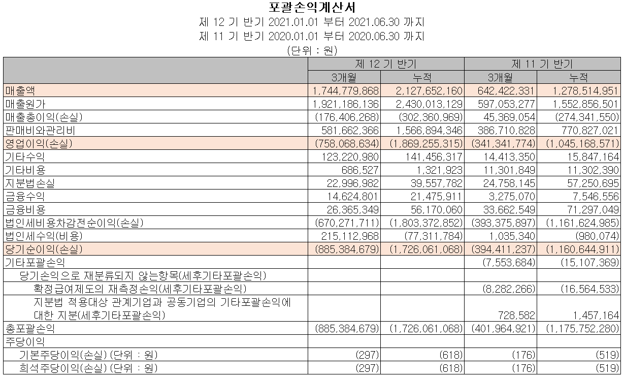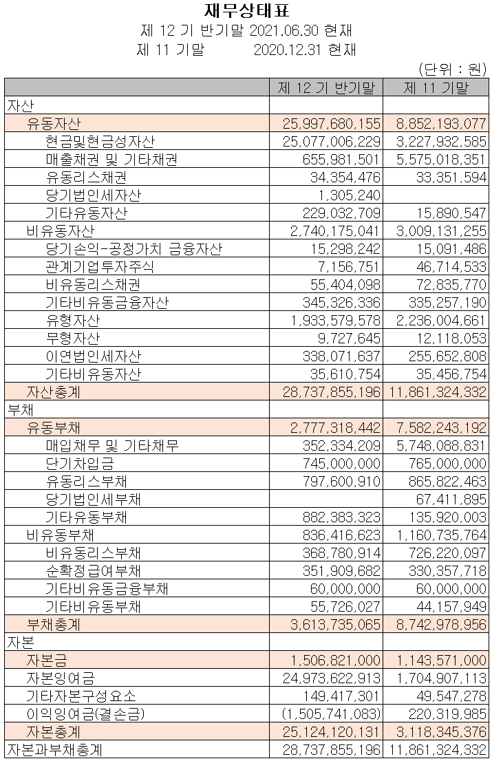 지난 상반기 말 현재 자산총계는 전기 말보다 142.3% 늘어난 287억 원으로 유상증자로 인한 현금 및 현금성 자산의 증가에 기인합니다. 부채총계는 매입채무의 감소로 51억 원이 줄어든 36억 원을 기록했습니다. 당기 중 유상증자로 자본잉여금은 233억 원 증가했고, 결손금은 15억 원을 기록하면서 자본총계는 전기 말 대비 142.3% 증가한 251억 원입니다.