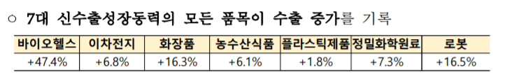 바이오헬스, 2차전지, 화장품, 농수산식품, 플라스틱 제품, 정밀화학원료 및 로봇 분야 등 신수출성장동력의 모든 분야에서 수출이 증가되었습니다.
