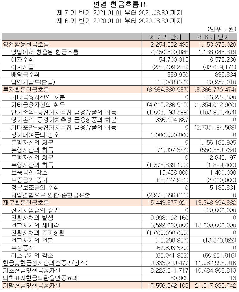 지난 상반기 영업활동 현금흐름에서는 23억 원의 현금이 유입되었으며, 투자활동에서는 기타금융자산의 취득과 종속기업인 (주)맥텔의 지분 인수를 통한 사업결합 등으로 84억 원의 현금이 유출되었습니다. 재무활동에서는 전환사채의 발행 및 재매각을 통해 자금을 조달하였고, 당기 부채 등을 상환하면서 총 154억 원의 현금이 유입되었습니다. 2021년 상반기 말 기준 현금 및 현금성 자산은 전년 동기 대비 40억 원이 줄어든 176억 원을 보유하고 있습니다.