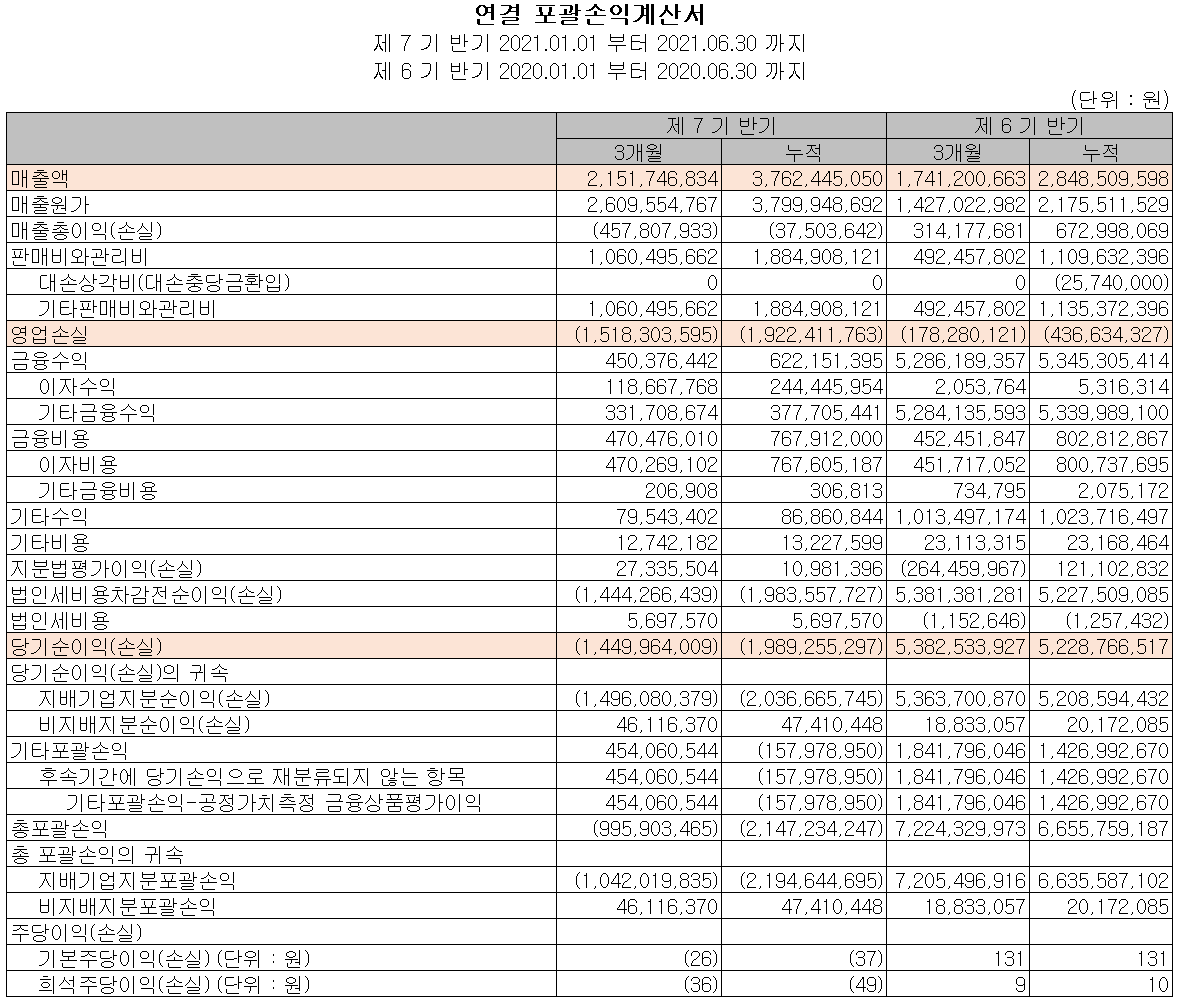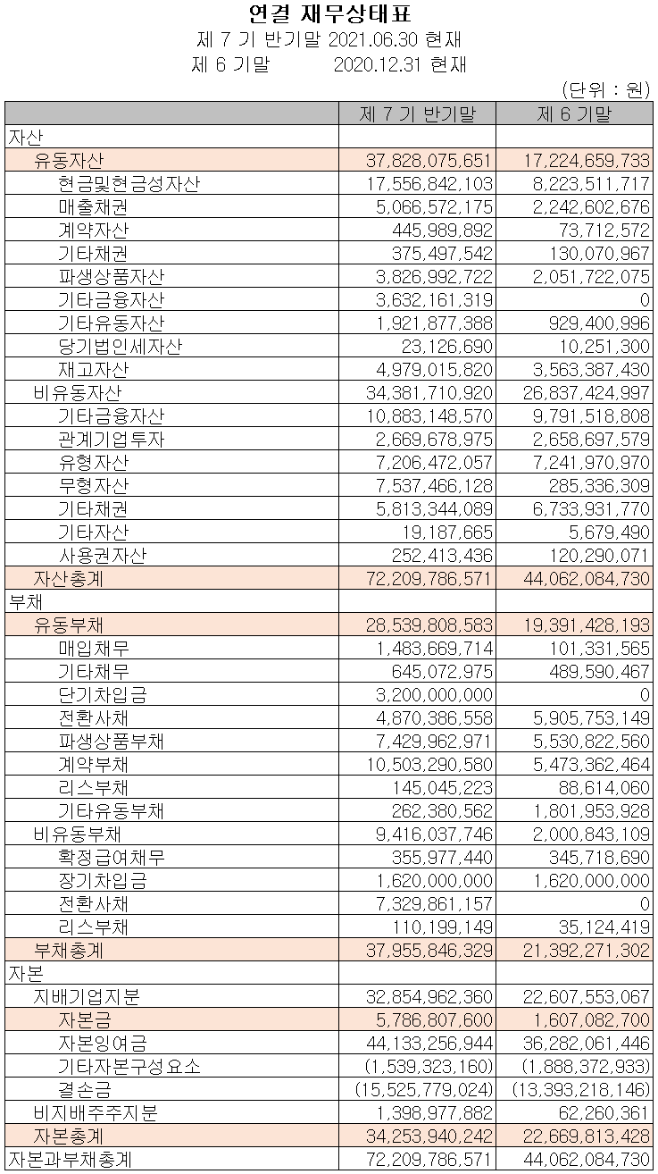 지난 상반기 말 현재 자산총계는 전기 말보다 63.9% 증가한 722억 원으로 현금 및 현금성 자산, 매출채권, 파생상품, 기타금융자산 및 무형자산 등 조로 사업 결합에 따른 자산의 증가에 기인합니다. 부채총계는 77.4% 늘어난 380억 원으로 매입채무, 단기차입금, 파생상품, 계약부채, 전환사채 등의 증가에 따릅니다.