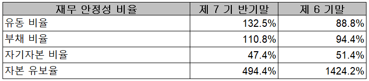 2021년 상반기 말 기준 재무안정성 비율에서는 유동비율 132.5%, 부채비율 110.8%, 자기자본비율 47.4%, 자본유보율 494.4%를 기록하면서 부채비율이 증가했고, 자본금의 증가에 따른 유보율 변동이 있었습니다.