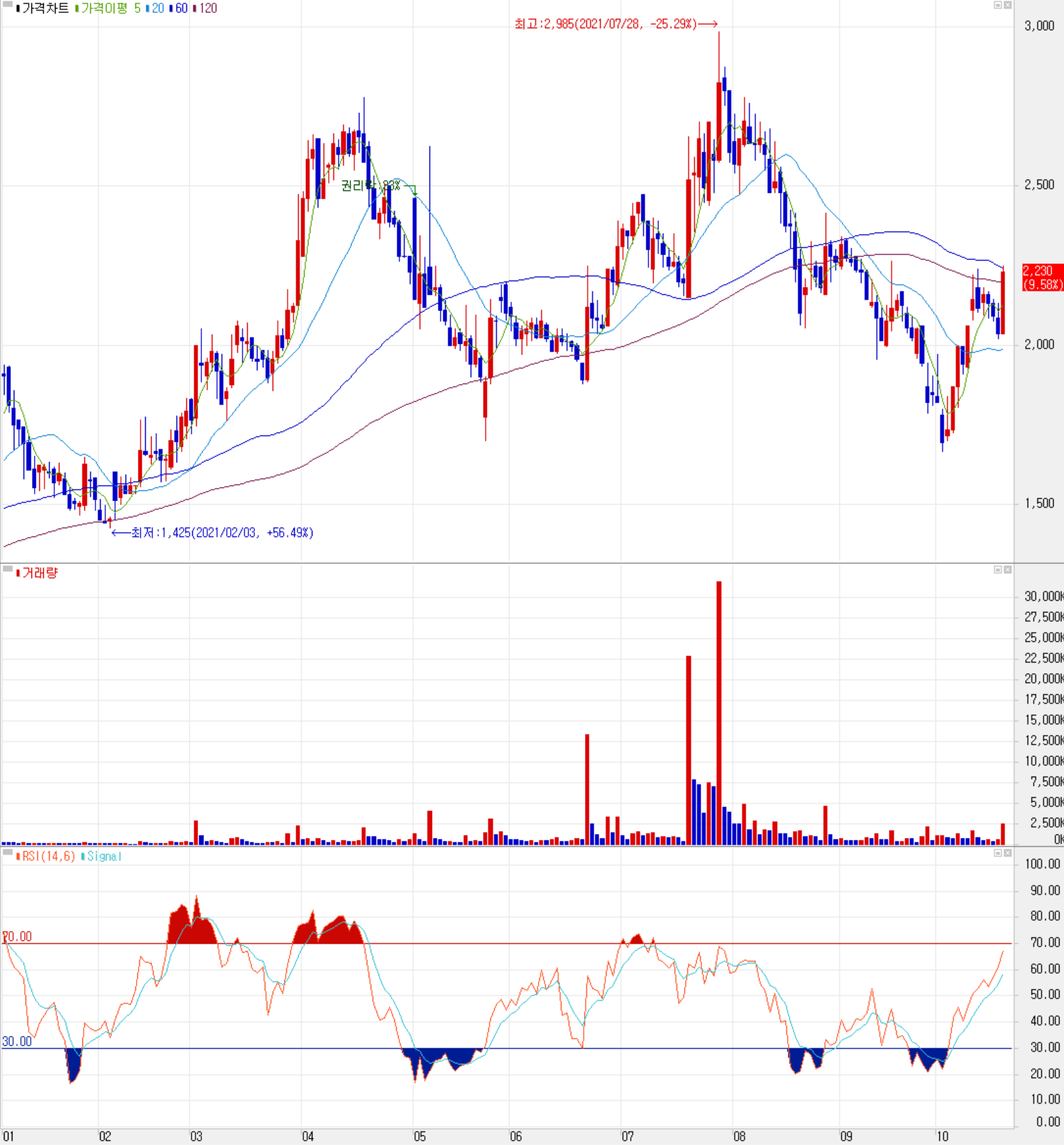 지난 분석글에서 1차 지지선인 2,650원을 하향 돌파하면서 시장 변동성에 따른 하락으로 1,700원 부근까지 떨어졌던 주가는 10월 들어 반등하면서 현재 2천 원대 초반에서 주가가 형성되고 있습니다. 최근 수급에서는 기관과 외국인의 매수 유입으로 주가 상승을 이끌고 있으며 개인은 9 거래일 연속 순매도 중입니다. 사업 전망 및 차트 소견을 종합한 개인적인 목표주가는 2,600원입니다.