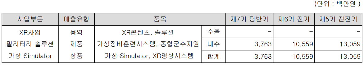 당사는 AR/VR/MR을 융합하는 확장 현실 플랫폼 서비스, 음성 AI, SMART 국방 등 밀리터리 솔루션 등을 제공하는 사업을 영위하고 있습니다.