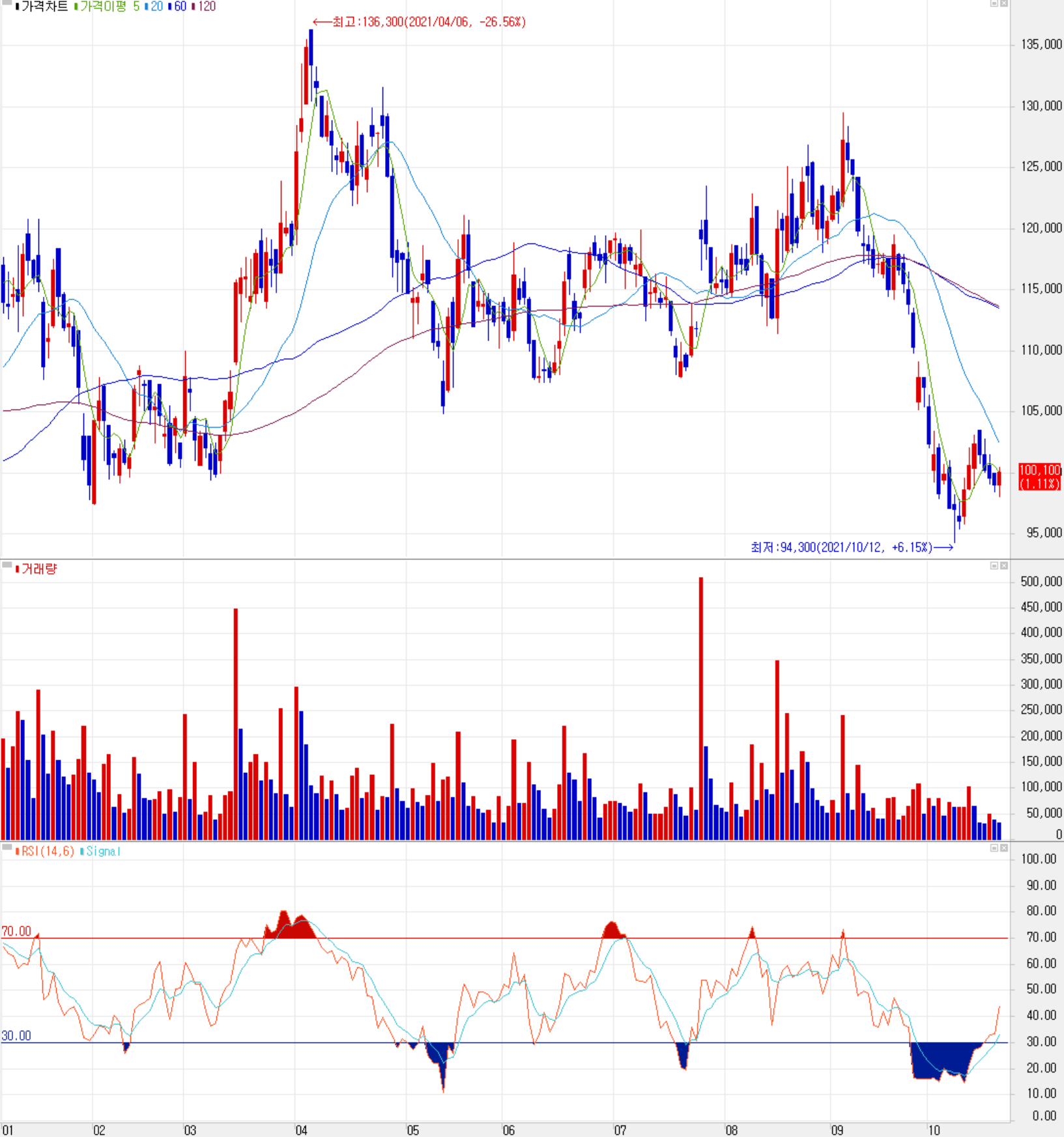 최근 당사의 주가는 지난 9월 들어서면서 당사의 주력 제품인 레이저 마커를 중심으로한 실적 증가로 긍정적인 3분기 실적 전망이 나오면서 상승 출발했으나, 미국 금리 인상 및 인플레이션 이슈에 따른 시장 변동성으로 비교적 큰 폭의 조정을 받으면서 10만 원 근처에서 주가가 형성되고 있습니다. 예상 실적 및 차트 소견을 종합한 개인적인 목표주가는 124,000원으로 설정하였습니다.