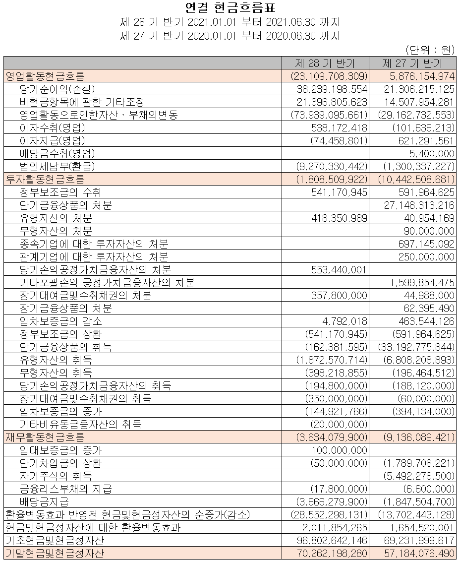 지난 상반기 영업활동 현금흐름은 운전자산의 변동에 따라 231억 원의 현금이 유출되었으며, 투자활동에서는 유무형 자산의 취득에 따라 18억 원의 현금이 유출되었습니다. 재무활동에서는 당기 부채를 상환하고 배당금을 지급하면서 36억 원의 현금이 유출되었습니다. 2021년 상반기 말 기준 현금 및 현금성 자산은 전기말보다 131억 원이 증가한 703억 원을 보유하고 있습니다.