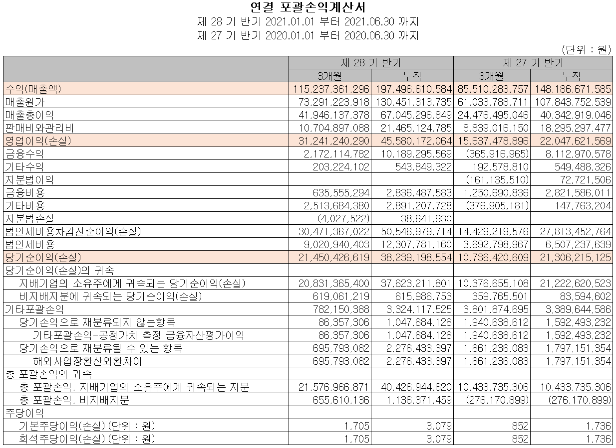 지난 상반기 말 현재 자산총계는 전기 말보다 9.7% 늘어난 5,279억 원으로 매출채권 및 재고자산과 기타비유동금융자산의 증가에 기인합니다. 부채총계는 12.4% 늘어난 801억 원으로 매입채무 및 기타유동부채의 증가에 따릅니다. 자본총계는 이익의 증가로 전기 말 대비 9.2% 늘어난 4,477억 원을 기록했습니다.