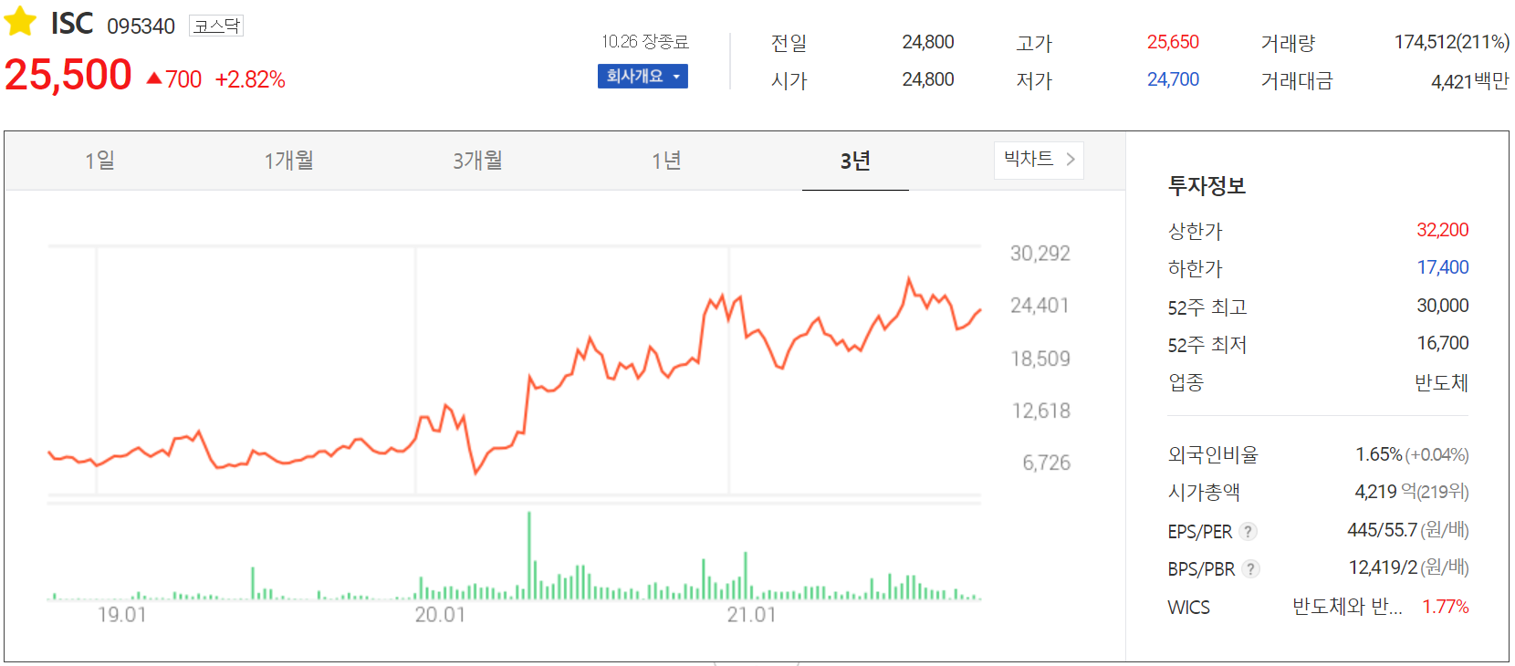 10월 26일 장 종료 기준 당사의 주가는 전일보다 2.82% 오른 25,500원에 거래를 마감했습니다. 외국인 비중은 1.65%이며, 시가총액 4,219억 원으로 코스닥 시총 기준 219위 종목입니다.