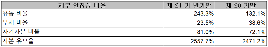 2021년 상반기 재무 안정성 비율에서는 유동비율 243.3%, 부채비율 23.5%, 자기자본비율 81%, 자본유보율 2,557.1%를 기록하면서 안정적인 재무상태를 유지하고 있습니다.