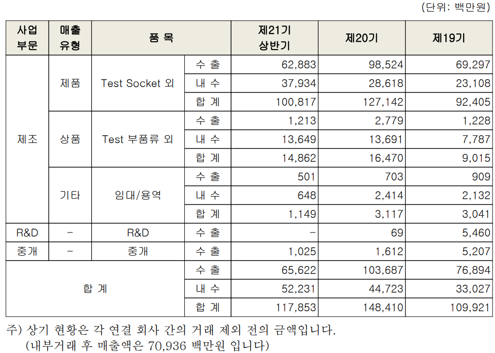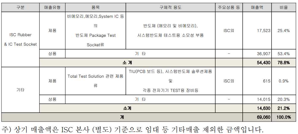 당사는 반도체 테스트용 제품을 제조, 공급하는 단일 사업부문으로 세부적으로는 메모리 및 비메모리 반도체용 테스트 소켓과 테스트 솔루션 관련 PCB 보드 등을 공급하고 있습니다. 지난 상반기 ISC TEst Socket의 매출액은 544억 원으로 전체 매출의 78.8%를 차지하였으며, 기타 테스트 솔루션 관련 제품의 매출은 146억 원으로 21.2%의 매출 비중을 기록했습니다.