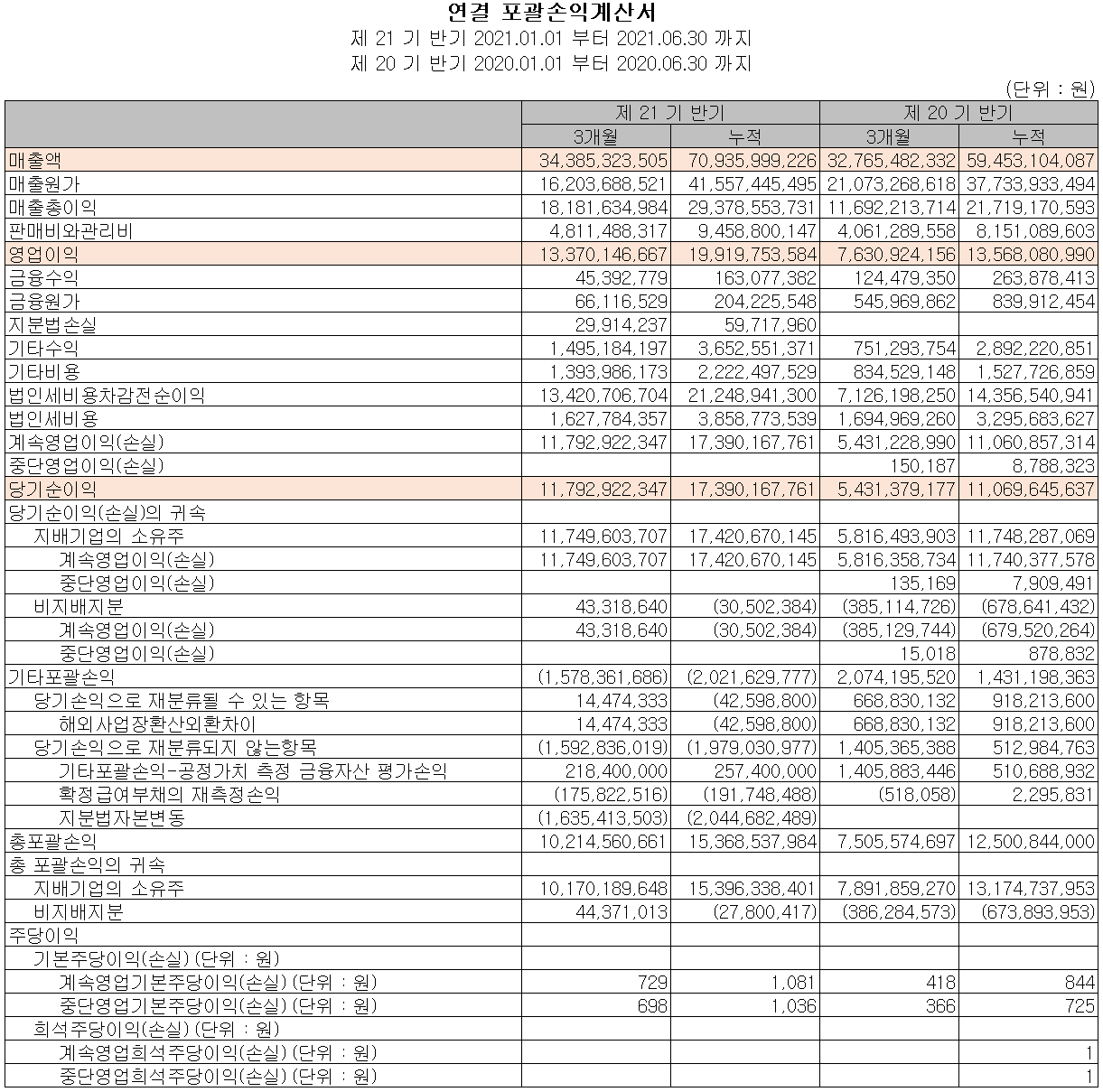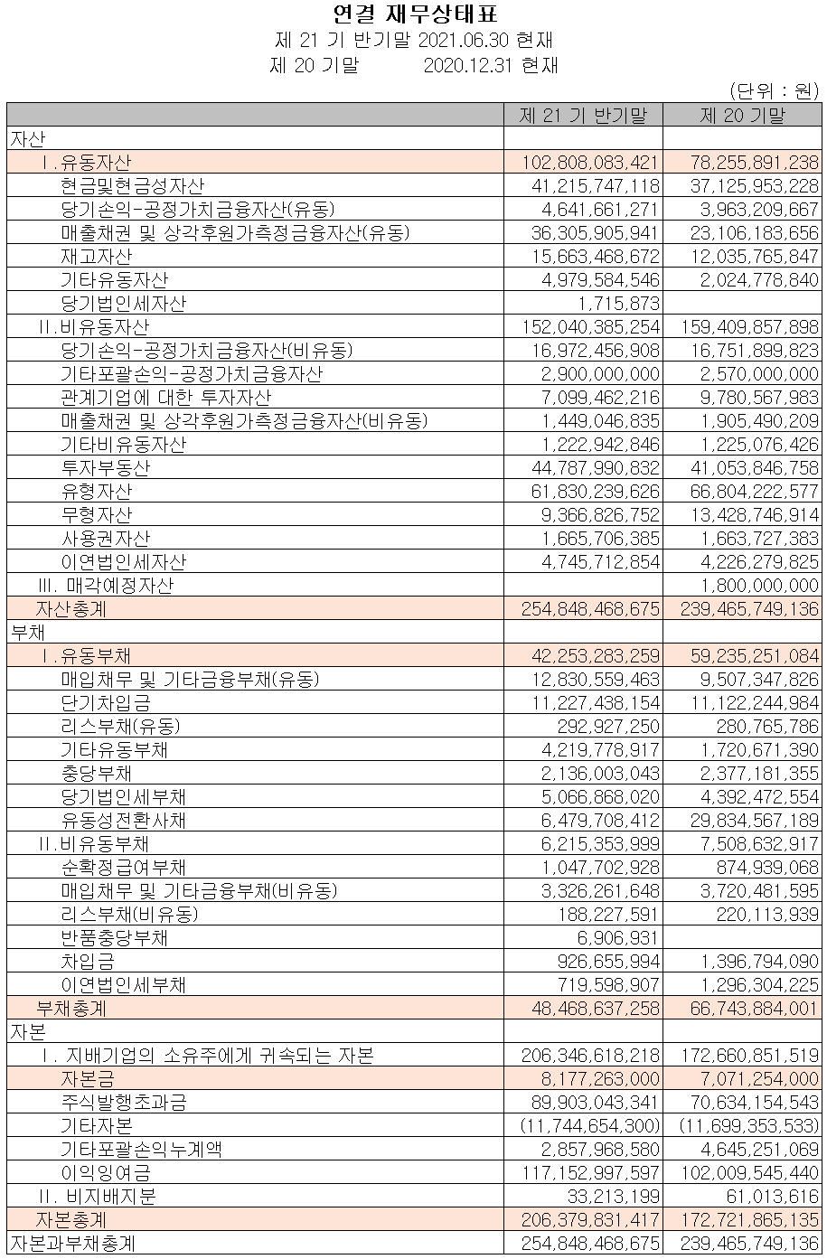 지난 상반기 현재 자산총계는 전기 말보다 6.4% 늘어난 2,548억 원으로 현금성자산, 재고자산 및 기타 유동자산 등에 기인합니다. 부채총계는 27.4% 감소한 485억 원으로 주로 전환사채의 감소가 있었습니다. 자본에서는 전환사채의 전환으로 자본금과 주식발행 초과금이 늘어났고, 당기순이익의 증가로 이익잉여금이 늘어나면서 당기 말 자본총계는 337억 원이 늘어난 2,064억 원을 기록했습니다.