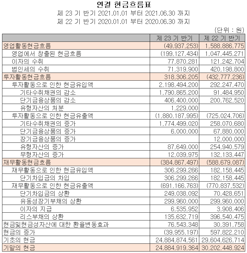 지난 상반기 영업활동 현금흐름에서는 49백만 원의 현금이 유출되었으며, 투자활동에서는 유무형 자산의 증가 등 투자활동으로 인한 현금 유출이 있었으나, 수취채권 및 단기 금융상품의 감소에 따라 3억 원의 현금이 유입되었습니다. 재무활동에서는 3억 원 규모의 차입이 있었으며, 당기 부채를 상환하면서 4억 원의 현금이 유출되었습니다. 2021년 상반기 말 기준 현금은 전년 동기 대비 53억 원이 줄어든 249억 원을 보유하고 있습니다.