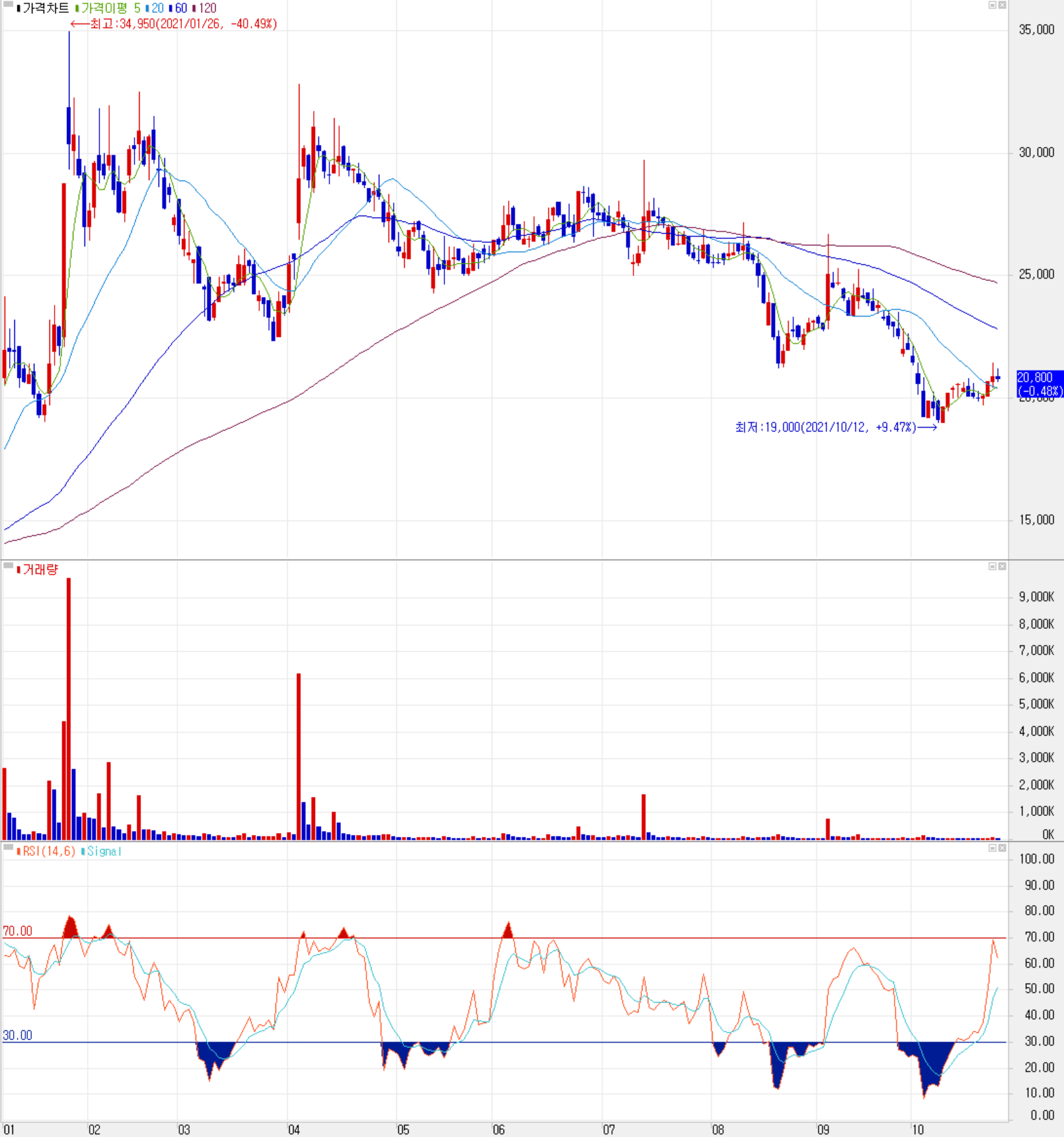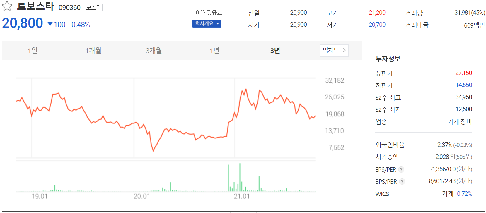 로보스타 주가 추이(일봉: 2021.01 ~ 2021.10)