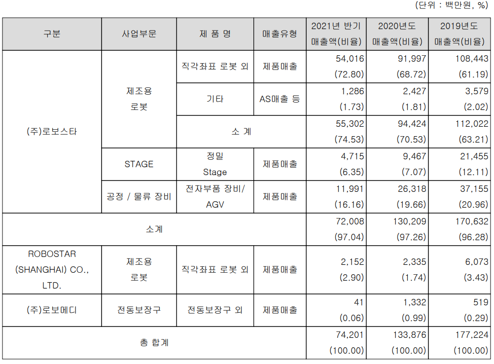당사는 모바일, 디스플레이, 자동차, 반도체, 2차전지 등 다양한 제조 시설의 산업용 로봇과 자동화 장비를 제조, 공급하는 사업을 영위하고 있습니다. 이중 당사와 종속회사인 ROBOSTAR(SHANGHAI) Co., LTD는 제조용 로봇을 중심으로 (주)로보메디는 전동보장구 사업을 중심으로 사업을 운영하고 있습니다.
