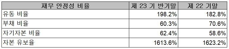 2021년 상반기 말 기준 재무안정성 비율에서는 유동비율 198.2%, 부채비율 60.3%, 자기자본비율 62.4%, 자본유보율 1613.6%를 기록하면서 비교적 양호한 재무상태를 유지하고 있습니다.