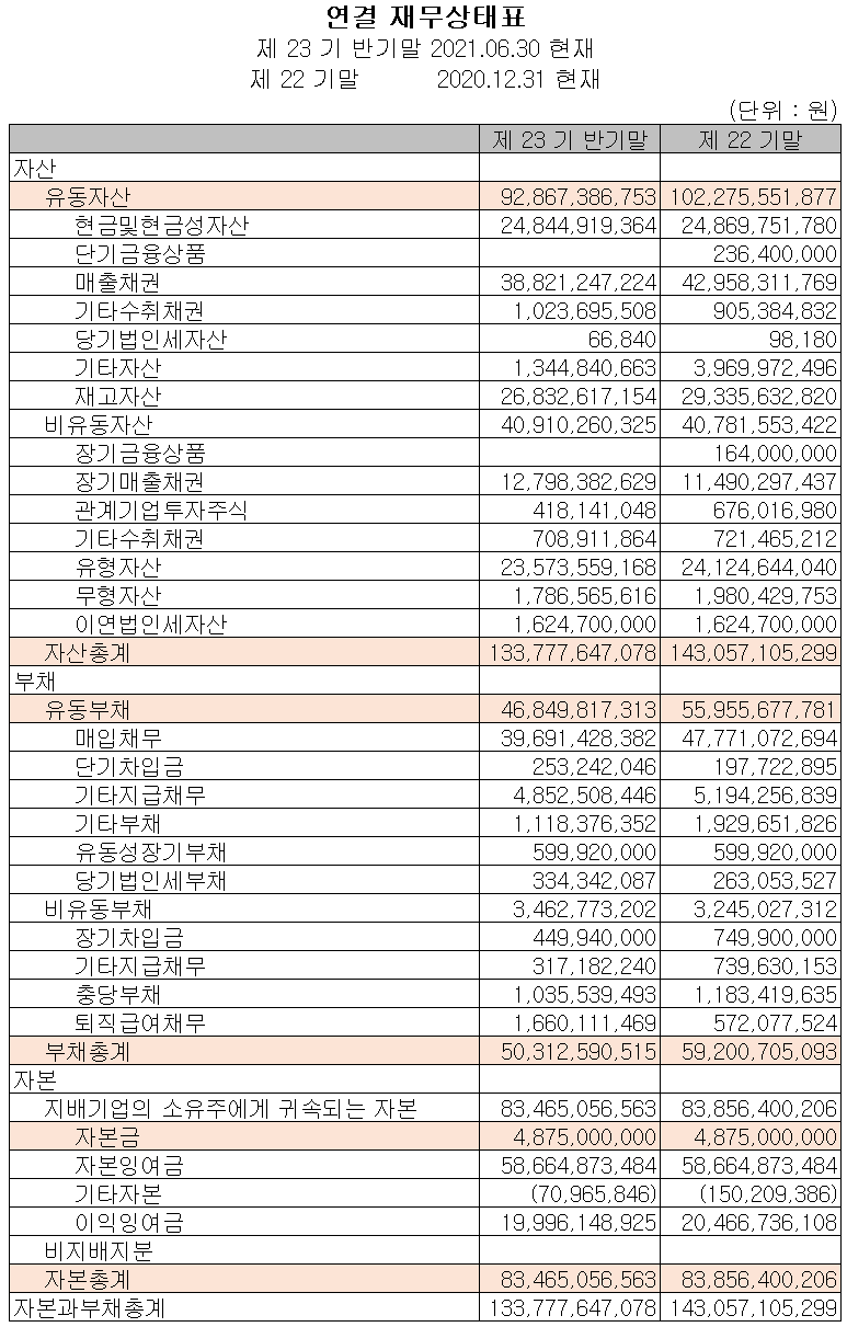 지난 상반기 말 현재 자산총계는 전기 말보다 6.5% 줄어든 1,338억 원으로 매출채권, 재고자산 등의 감소에 기인합니다. 부채총계는 15% 줄어든 503억 원으로 매입채무 및 장기차입금과 기타지급채무의 감소에 따릅니다. 자본총계에서는 해외사업 환산손실에 따른 기타 자본의 감소와 당기 손실에 따른 이익잉여금의 감소로 0.5% 줄어든 835억 원을 기록했습니다.