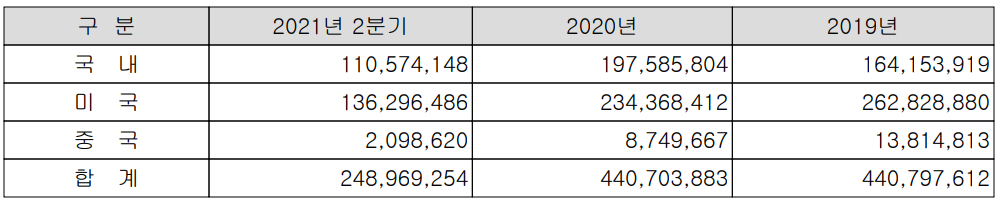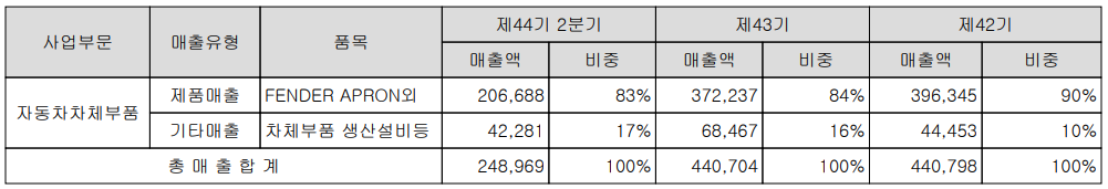 당사는 자동차 차체, 자동차 전장 및 IT 부문 등 차량용 부품을 미국, 중국 및 국내 6개 종속회사와 함께 생산 및 판매를 하고 있습니다. 지난 상반기 기준 국내 매출은 1,106억 원으로 전체 매출의 44.4%를 차지하였으며, 미국은 1,363억 원으로 54.7%, 중국은 21억 원으로 0.8%의 매출 비중을 나타냈습니다.