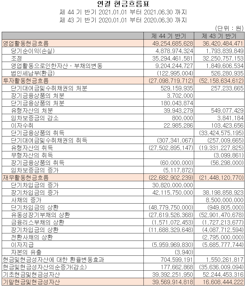 지난 상반기 영업활동 현금흐름에서는 0.5억 원의 현금이 유입되었으며, 투자활동에서는 건설 중인 자산과 설비가 증가하면서 271억 원의 현금이 유출되었습니다. 재무활동에서는 차입금의 차입으로 당기 부채를 상환하였으며, 이자를 지급하면서 총 227억 원의 현금이 유출되었습니다. 2021년 상반기 말 기준 현금 및 현금성 자산은 전년 동기 대비 138.3% 늘어난 396억 원을 보유하고 있습니다.