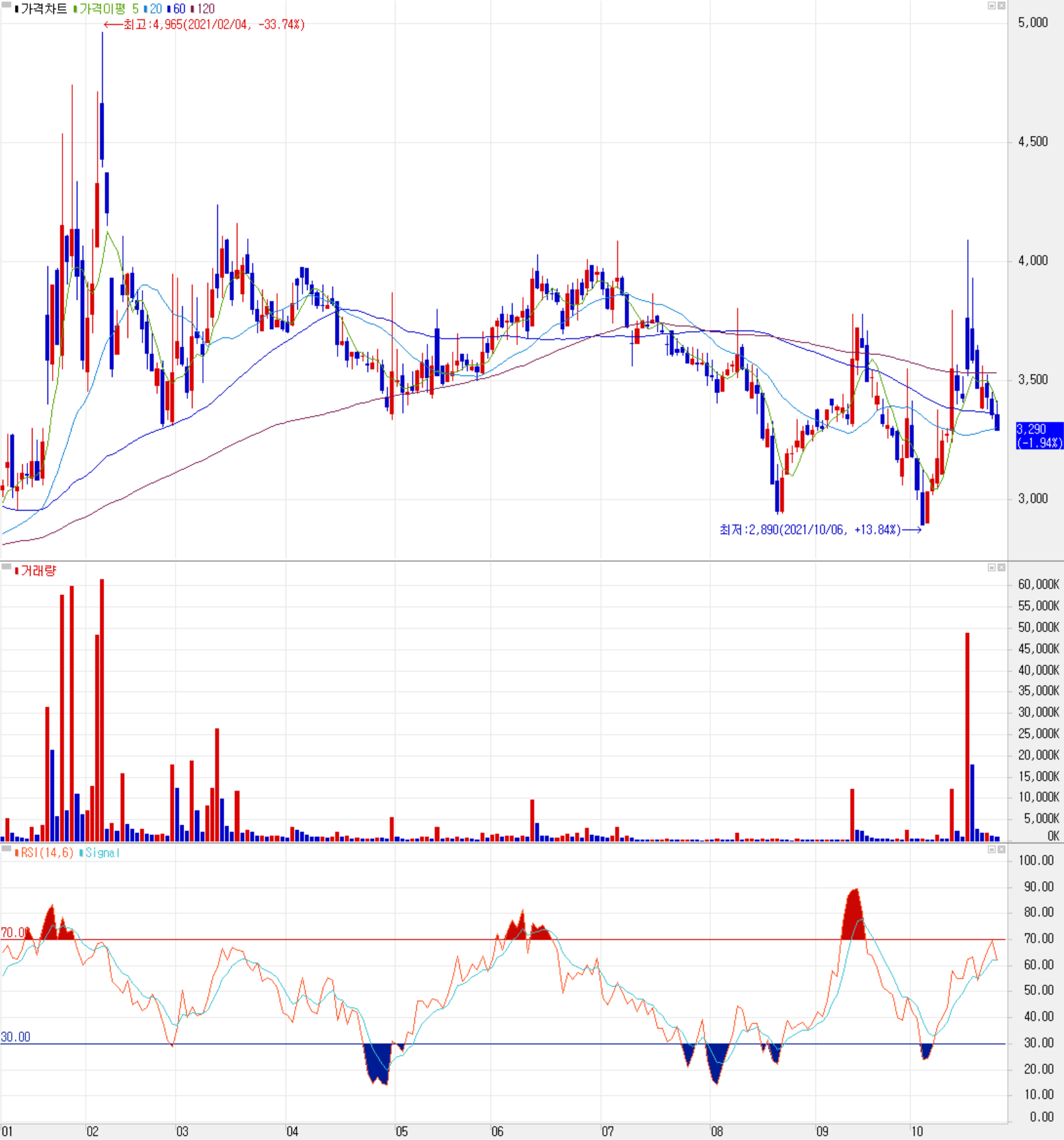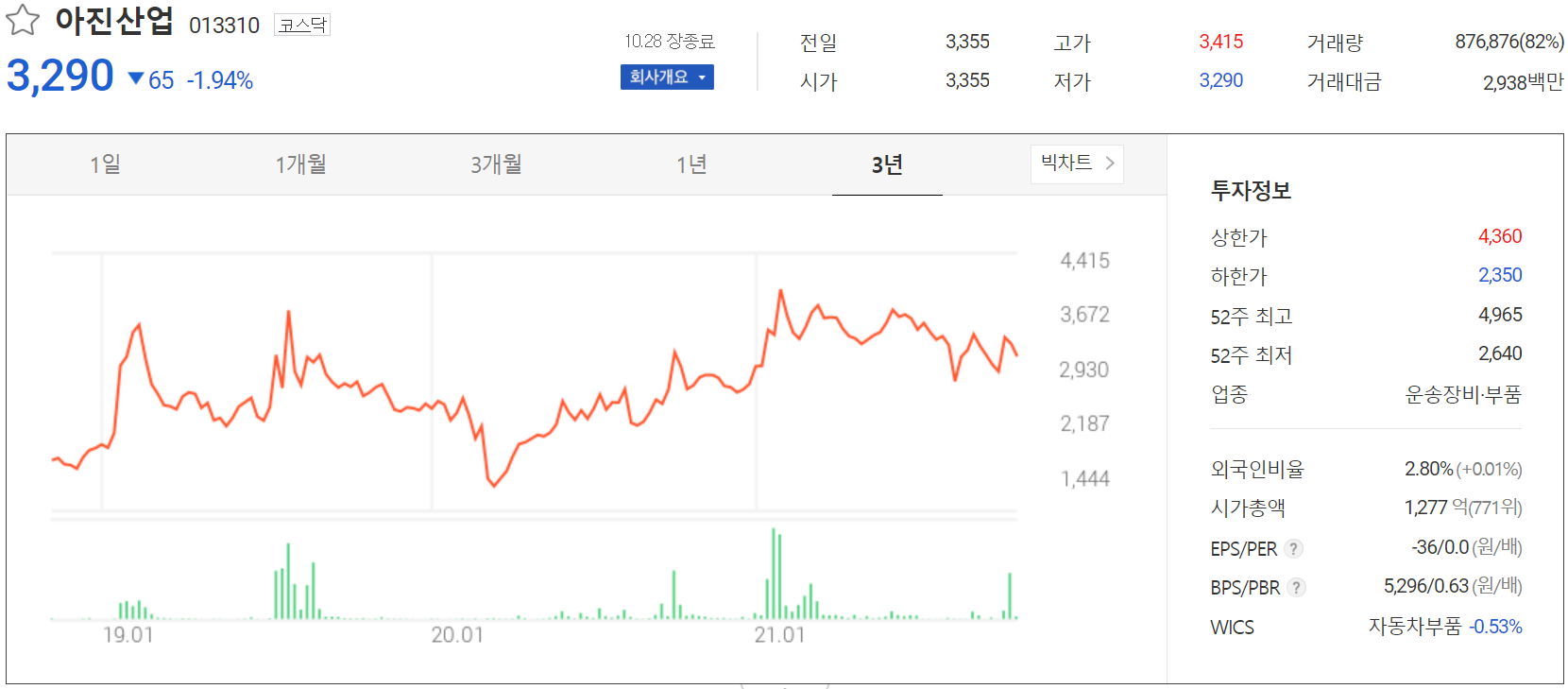 10월 28일 장 종료 기준 당사의 주가는 전일보다 1.94% 내린 3,290원에 거래를 마감했습니다. 외국인 비중은 2.8%이며, 시가총액 1,277억 원으로 코스닥 시총 기준 771위 종목입니다.