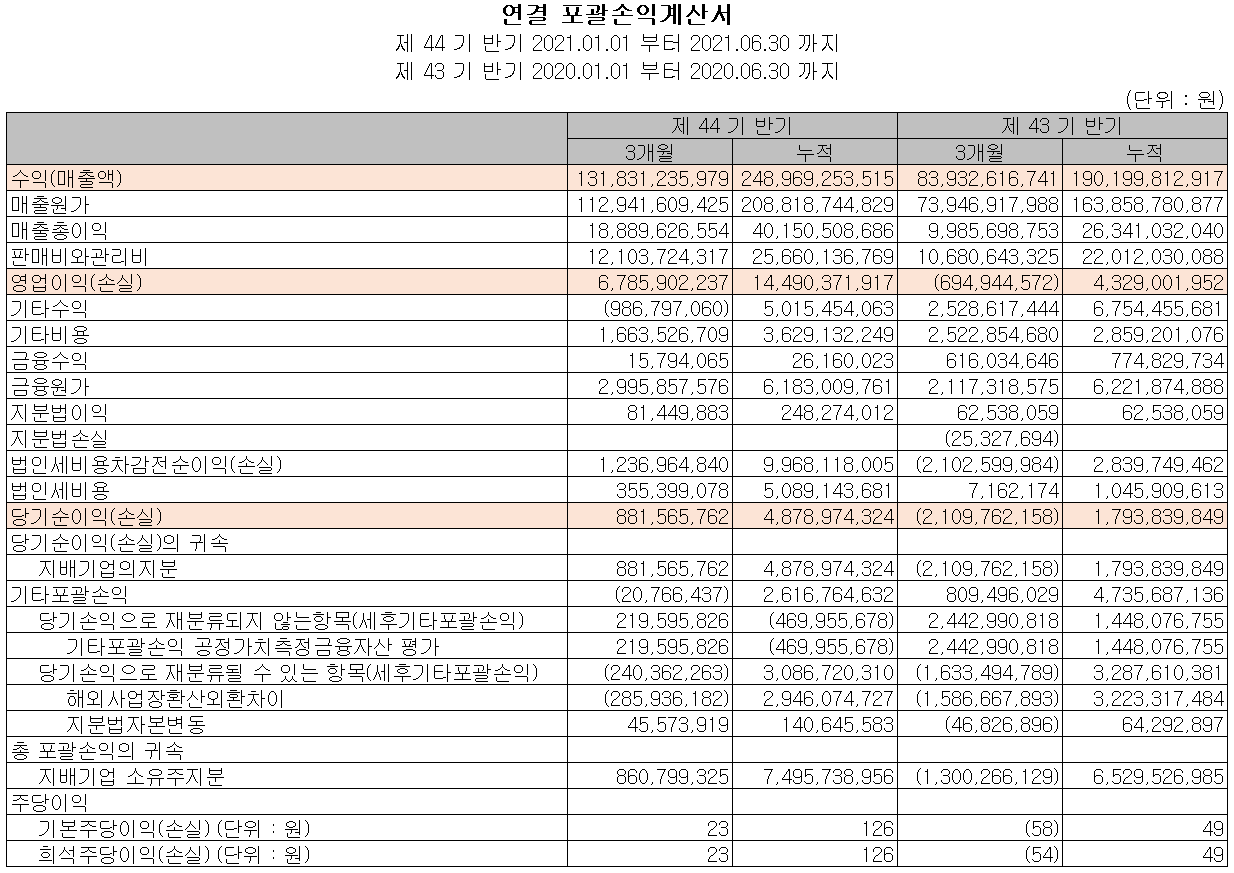 지난 상반기 현재 자산총계는 전기 말보다 5% 증가한 6,593억 원으로 매출채권, 재고자산 및 유형자산의 증가에 기인합니다. 부채총계는 5.1% 늘어난 4,482억 원으로 매입채무, 기타유동부채 및 장기차입금의 증가가 있었습니다. 해외사업장의 환산외환차익의 증가로 기타포괄손익누계액이 증가했고, 이익의 증가로 잉여금이 증가하면서 자본총계는 98억 원이 늘어난 2,112억 원을 기록했습니다.