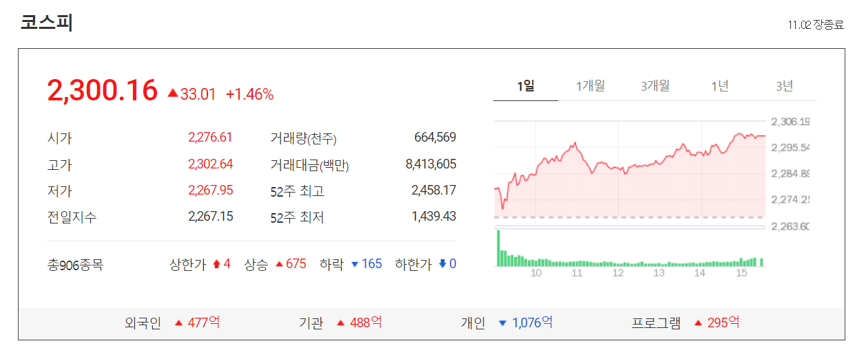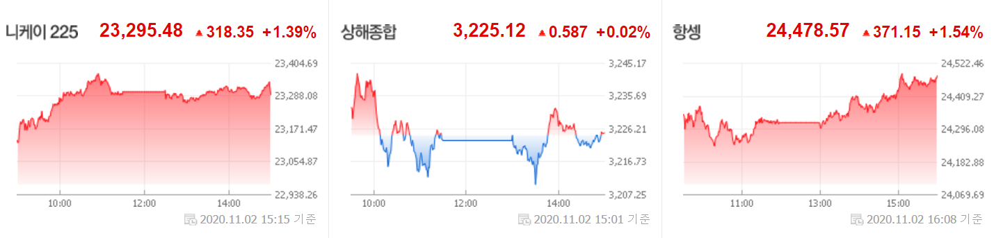 지난 금요일 미국 뉴욕 지수는 대선 불확실성과 코로나19 재확산으로 특히 기술주의 하락이 컸지만 오늘 한국 증시는 상승출발과 함께 오전 중 이주열 한국은행 총재의 "각별한 경계심을 갖고 시장 동향을 면밀히 모니터링 하면서 필요한 경우 시장 안정화 조치를 적기에 실시할 것"이라고 언급하면서 기관과 외국인의 동반 매수에 코스피는 2300선을 코스닥은 800선을 회복하면서 마감했습니다. 아시아 증시는 중국 경기 지표의 호조로 인해 대부분 상승 마감했습니다. 미국 대선 2일 남겨둔 오늘이었습니다.